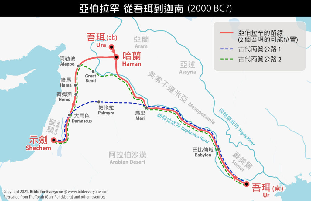| 旅程:從哪裡到哪裡? 亞伯蘭一行的旅程分為兩個主要階段: 第一階段:從吾珥到哈蘭(中途的停頓) 出發地:吾珥(Ur)。這是亞伯蘭的故鄉,位於美索不達米亞南部(今伊拉克境內),是古代蘇美文明的重要城市,崇拜月神「南納」(Sin)。 同行者:亞伯蘭與他的妻子撒萊、父親他拉、侄兒羅得,以及他們在吾珥積攢的財物和人口。 中途站:他們沿著肥沃的新月地帶向北遷徙,最終到達了一個名叫哈蘭(Haran)的城市並定居下來。 |